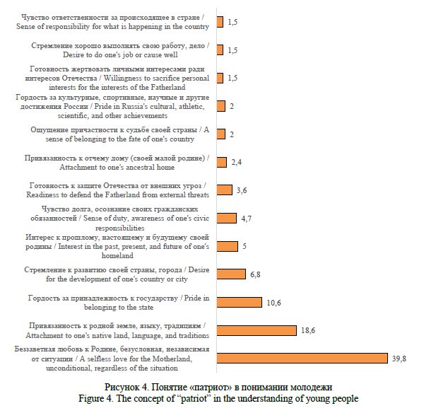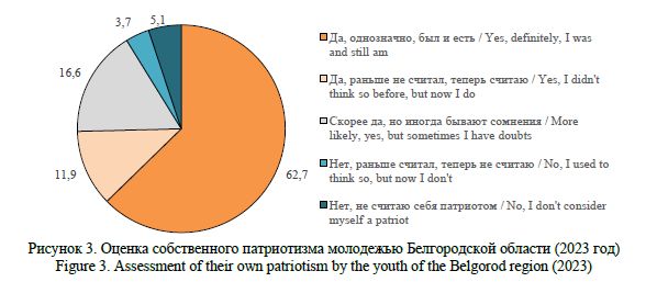 The author of the article reveals the characteristics of young people's ideas about patriotism. Patriotism is considered a universal value that should be instilled in modern youth through three key principles: citizenship, peace and culture. The author believes that patriotism as a form of attitude to social reality in the youth environment can be a stable vector, preserved in rapidly changing trends in the political, cultural, social spheres. Theoretical analysis of the concept of patriotism revealed its ambivalence: constructive aspects include love for the Motherland, pride in the country and national identity, while destructive aspects include the imposition of opinions from outside the country, narrow nationalism and the glorification of extremism. Constructive patriotism, as one of the forms of manifestation of citizenship, should have a creative force that can unite people and reduce various discriminatory forms of destructive behavior. The empirical section of the article presents data from studies conducted in 2022-2023, in which young people from the Belgorod region participated. It was determined that young people perceive patriotism through an active civic position, social justice and attachment to the country and the Motherland. Most of the respondents consider themselves patriots (while there is a significant positive trend in relation to 2019). However, there are also some negative influences of an anti-patriotic orientation, which necessitates the formation of optimal forms of social regulation based on ensuring the internalisation of the values of patriotism by modern youth. The study's findings can be summarised as the identification of a triune form of patriotism, based on socio-cultural values, political features of societal development, and spiritual and moral education.