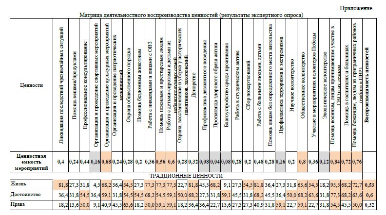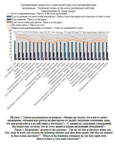 Traditional values are the basis of the national idea and the foundation of socialization of modern youth. The existing contradiction between the systemic declaration and transmission of traditional values and the success of their internalization by young people determines the importance of searching for methodological and methodical approaches to studying the processes of their adoption. The article considers the results of the 2024 monitoring proyect, 'Social Strategies of Regional Youth' (n = 5847, Belgorod region), which used the assessment of the social environment and the values visible in the regional space to demonstrate the gaps caused by socialisation problems and the ineffectiveness of the proposed approaches and methods for supporting the internalisation of values among young people. The division of values into groups according to the level of unity in interiorization made it possible to establish that human-measured values are most successfully assimilated by young people, and the greatest unity is achieved in relation to the value of Life, Rights, Dignity, Freedom, Morality and Mutual Respect. The values of civil society are usually at the second level of acceptance, showing problems with the internalization of such important values for our society as Patriotism and Service to the Fatherland. Based on the results of the expert study, the possibility of using the involvement of young people in public events as a way to increase the success of the processes of value internalization was determined, and a matrix of reproduction of values through public events and practices was built. Based on the expert survey, groups of value-intensive events were identified that can primarily be recommended for educational and upbringing programs in educational institutions. Such events include the organization and holding of cultural events, assistance to the elderly and elderly people, work with orphans and children from disadvantaged families, public volunteering, assistance to the military, persons participating in the Special Military Operation and their families, assistance in hospitals and clinics, assistance to refugees.