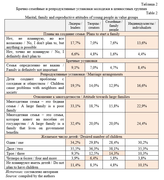 Relevance. Despite the existing set of measures, the birth rate in Russia remains significantly below the level of simple reproduction. The current model of state family policy focuses on material incentives, which is a necessary but insufficient condition for addressing demographic issues. The purpose of this article is to describe and analyze the implementation of state family policy at the regional level in relation to the value orientations of young people, their family and reproductive attitudes. The scientific problem lies in the discrepancy between the current material-oriented model of state family policy in the Russian Federation and the value diversity of modern youth. Methods. An analysis of regulatory, as well as a sociological survey among young people, were used. Scientific results. The analysis demonstrated that the model of family and demographic policy in Russia focuses primarily on material incentives to support the birth rate among young people. At the same time, a significant relationship between reproductive attitudes and the value orientations of young people was revealed. Only about a third (34.8%) of young people are oriented toward traditional family values, while the majority (about two-thirds) prioritize freedom, independence, creativity, and self-realization. Conclusions. Young people are a heterogeneous social group with varying motivations and responses to external stimuli. Understanding the value and motivational attitudes of different categories of youth (based on their focus on starting a family, the number of children they want, etc.) allows us to more effectively adapt social mechanisms and public policy strategies, fostering sustainable reproductive attitudes and support for family values among the younger generation.