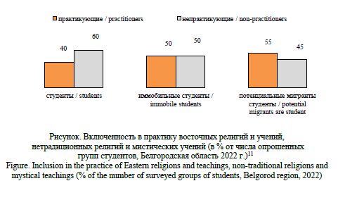 В условиях глобализации, миграционных трансформаций и растущей дифференциации духовных практик изучение нетрадиционных религиозных взглядов среди молодёжи приобретает особую актуальность и социально-научную значимость. Современные социальные изменения стимулируют поиск новых форм религиозной идентичности и способов удовлетворения духовных потребностей, особенно в периоды жизненных переходов и неопределённости. В статье рассматривается влияние миграционной мобильности/ иммобильности на мотивацию, интерес, формирование и практическую вовлеченность в нетрадиционные религии и учения среди студентов. В статье представлен комплексный анализ трех групп студентов: общая группа студентов, «потенциальные иммигранты» и «иммобильные» студенты, выявляется их различие по уровню интереса, мотивации и вовлеченности в нетрадиционные религиозные учения. Анализируется роль социальной среды, в частности семейных традиций, которые, несомненно, оказывают влияние на включенность в практику даже при низком личном интересе. Результаты показывают, что мобильность студентов усиливает внутреннюю мотивацию и способствует более активному духовному самоопределению, что обусловлено необходимостью социальной адаптации и поиска смысловых опор в условиях перемен, тогда как «иммобильные» студенты демонстрируют значительную роль культурного окружения в поддержании религиозной практики, даже при относительно низком собственном интересе. Эти данные подчёркивают сложность взаимодействия личностных, социально-культурных и ситуативных факторов в формировании нетрадиционного религиозного поведения. Понимание этих механизмов имеет важное значение для разработки программ поддержки студентов, а также для изучения процессов религиозной трансформации в условиях глобализации. Исследование способствует более глубокому осмыслению роли нетрадиционных религиозных движений в современной молодёжной среде.