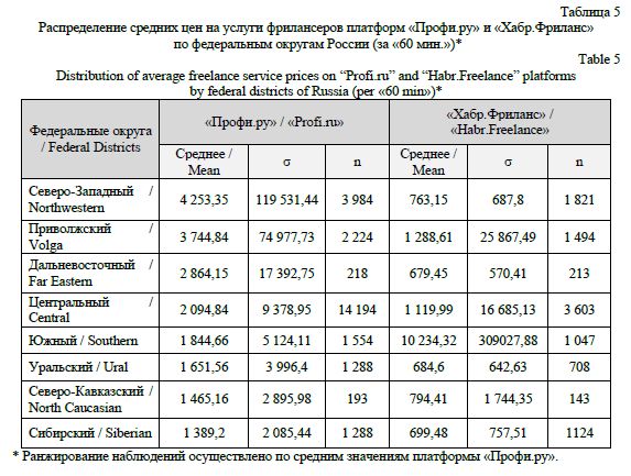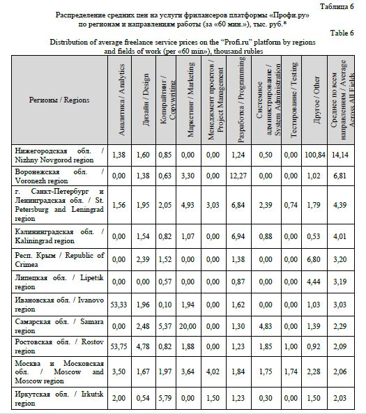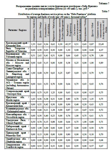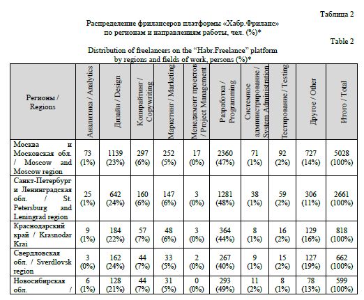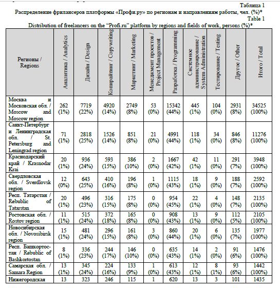 Исследование региональной специфики платформенной занятости и основных направлений предложения услуг фрилансеров обусловлено трансформацией рынка труда как в России, так и в мире: цифровизацией экономики и виртуализацией общества, распространением нестандартных форм занятости, развитием платформенной занятости и ростом числа платформенных работников. Объектом настоящего исследования стали профили исполнителей платформ по поиску и предложению работы «Профи.ру» (profi.ru) и «Хабр.Фриланс» (freelance.habr.com), работающих удаленно. Цель исследования заключается в выявлении структуры и специфики распределения услуг фрилансеров на сайтах profi.ru и freelance.habr.com. Эмпирической базой статьи стали профили фрилансеров, полученные в результате краулинга сайтов profi.ru (платформа «Профи.ру») и freelance.habr.com (платформа «Хабр.Фриланс»). В рамках данного исследования впервые выявлены и описаны особенности социально-демографической структуры, территориального распределения и отраслевой направленности специалистов, предлагающих услуги в сфере платформенного труда в России. Результаты исследования продемонстрировали, что наибольшая часть удаленных работников, представленных на платформах «Профи.ру» и «Хабр.Фриланс», сосредоточена в сферах разработки, копирайтинга и дизайна. К тому же эти направления предложения услуг остаются наиболее высокооплачиваемыми сферами фриланса. Распределение фрилансеров по регионам неравномерное, а наибольшая их доля наблюдается в субъектах Центрального и Северо-Западного федеральных округов. Результаты исследования не только фиксируют региональную специфику и основные направления предложения услуг фрилансеров, но и подчеркивают необходимость разработки мер по поддержке равномерного развития удаленной платформенной занятости в России.
